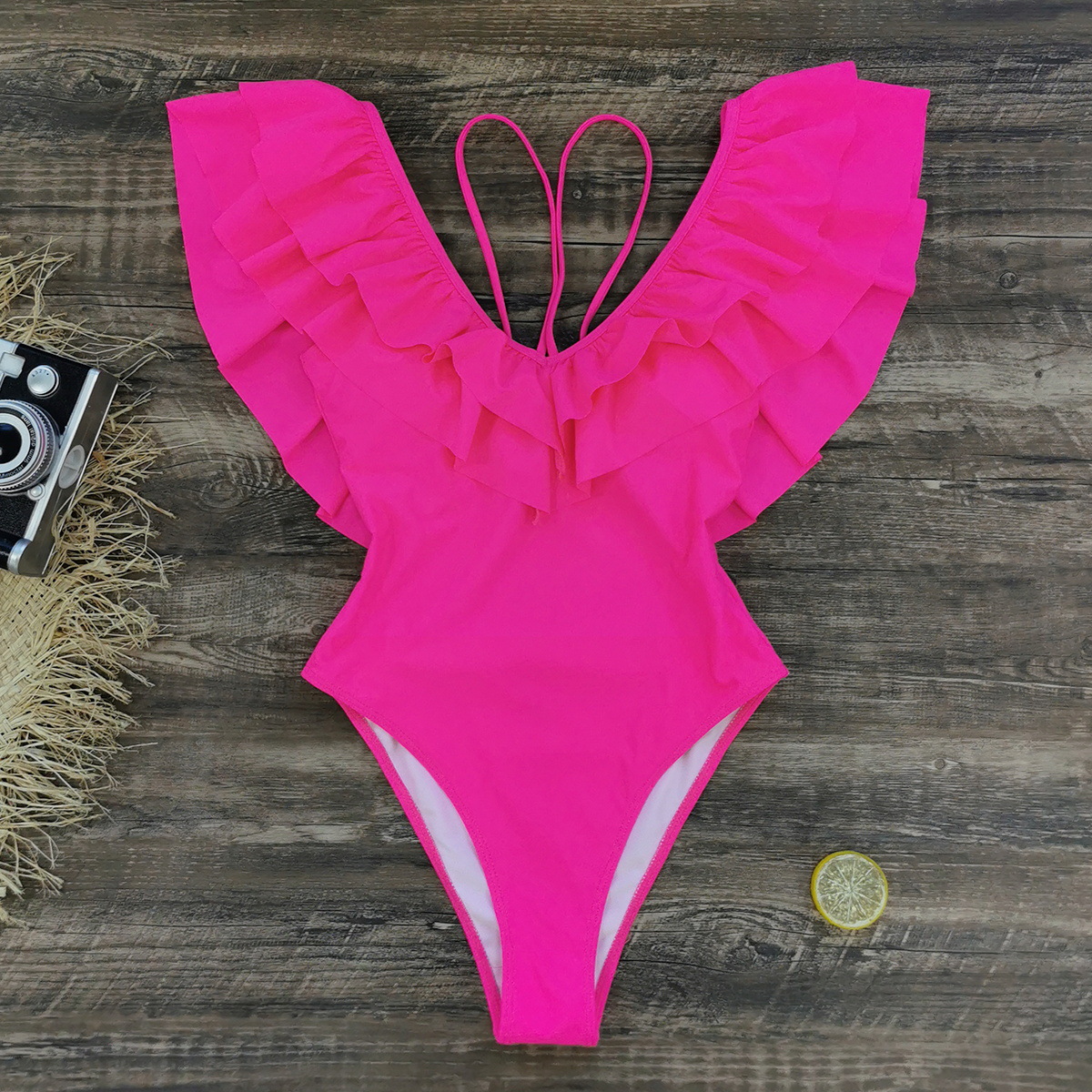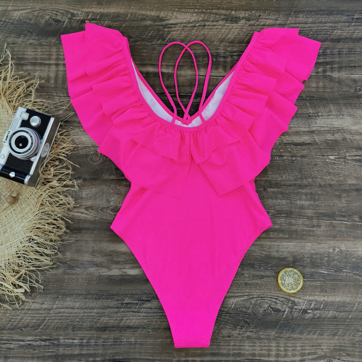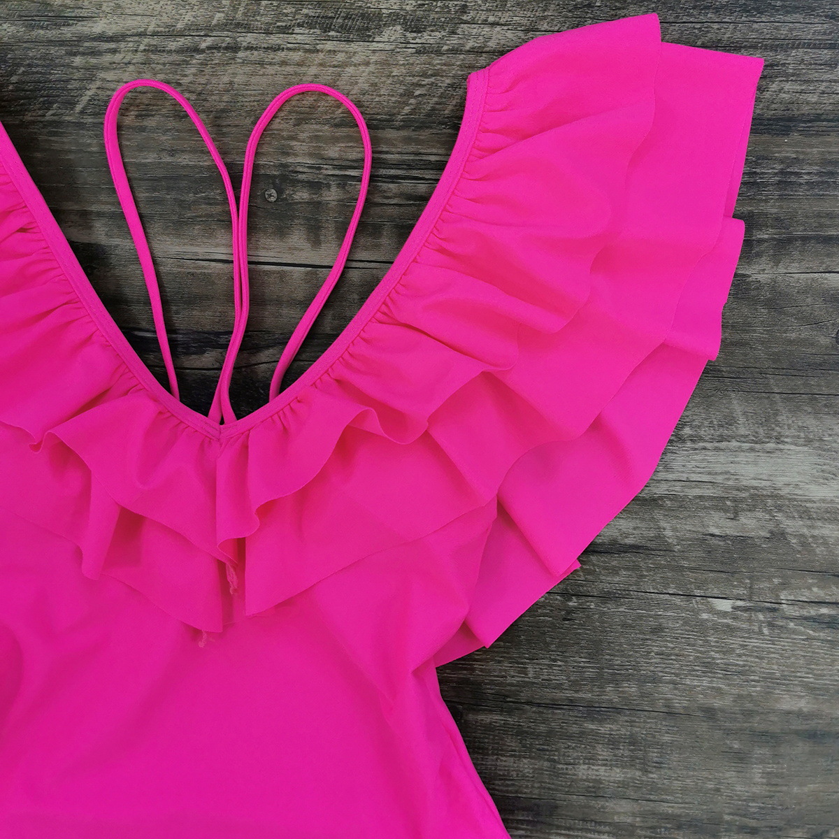 Solid Color Double Layer Ruffled Deep V Plunge Spaghetti Straps One Piece Swimsuit Women Swimsuit