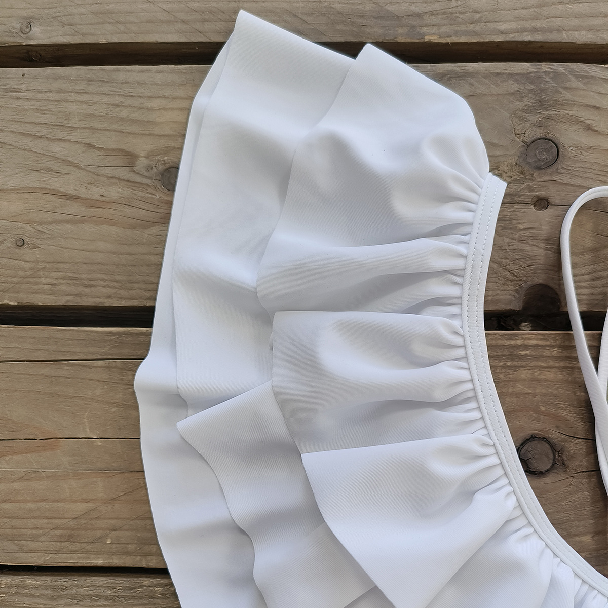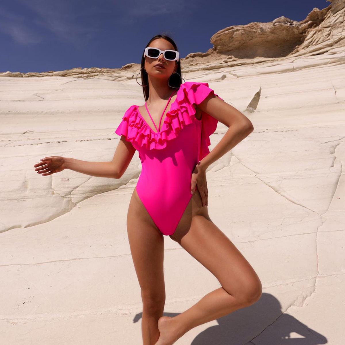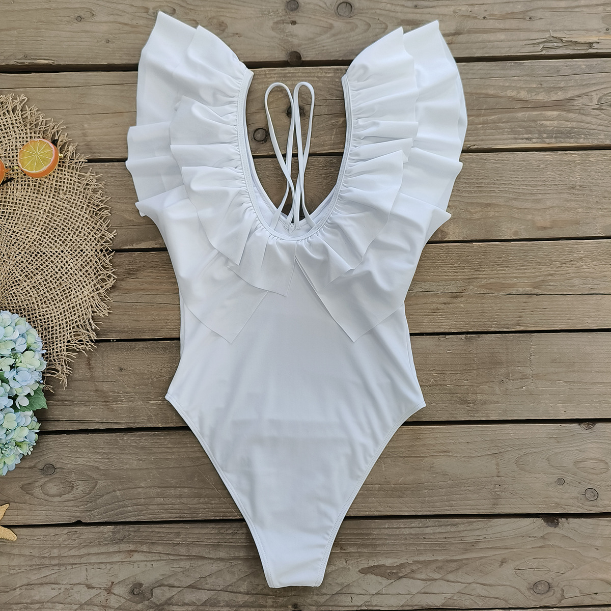 Solid Color Double Layer Ruffled Deep V Plunge Spaghetti Straps One Piece Swimsuit Women Swimsuit