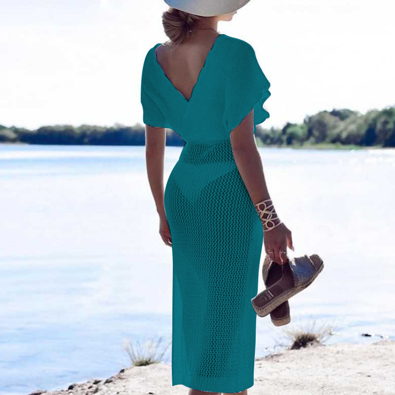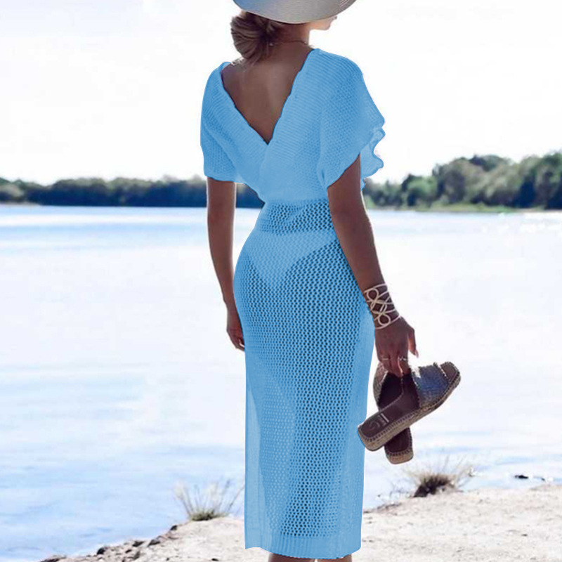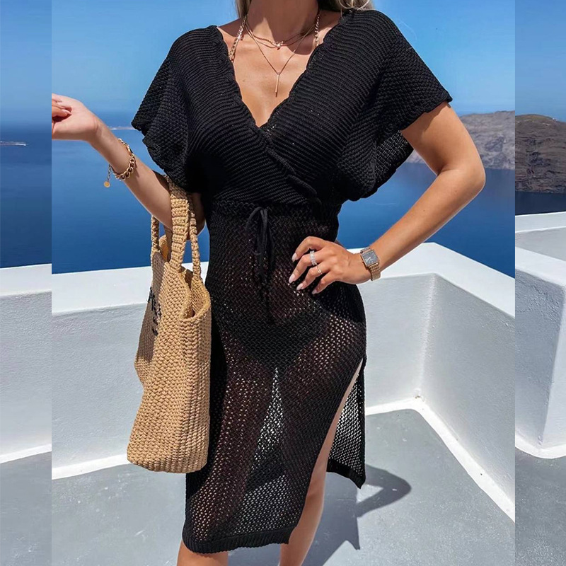 Summer Beach Dress Sexy Slit Short Sleeve Hollow Out Cutout out Strap Bikini Sun Shield Hanfu Long Robe Dress Crochet hook Crochet hook Crochet hook
