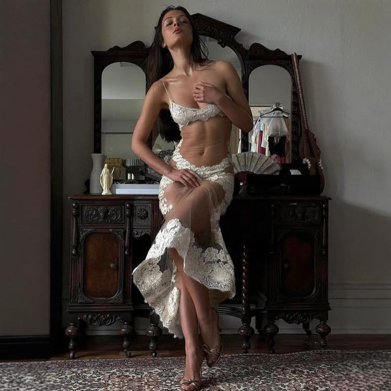 Summer Women Mesh Lace Lace Spaghetti Strap Dress See through Sexy Nightdress Vacation Maxi Dress