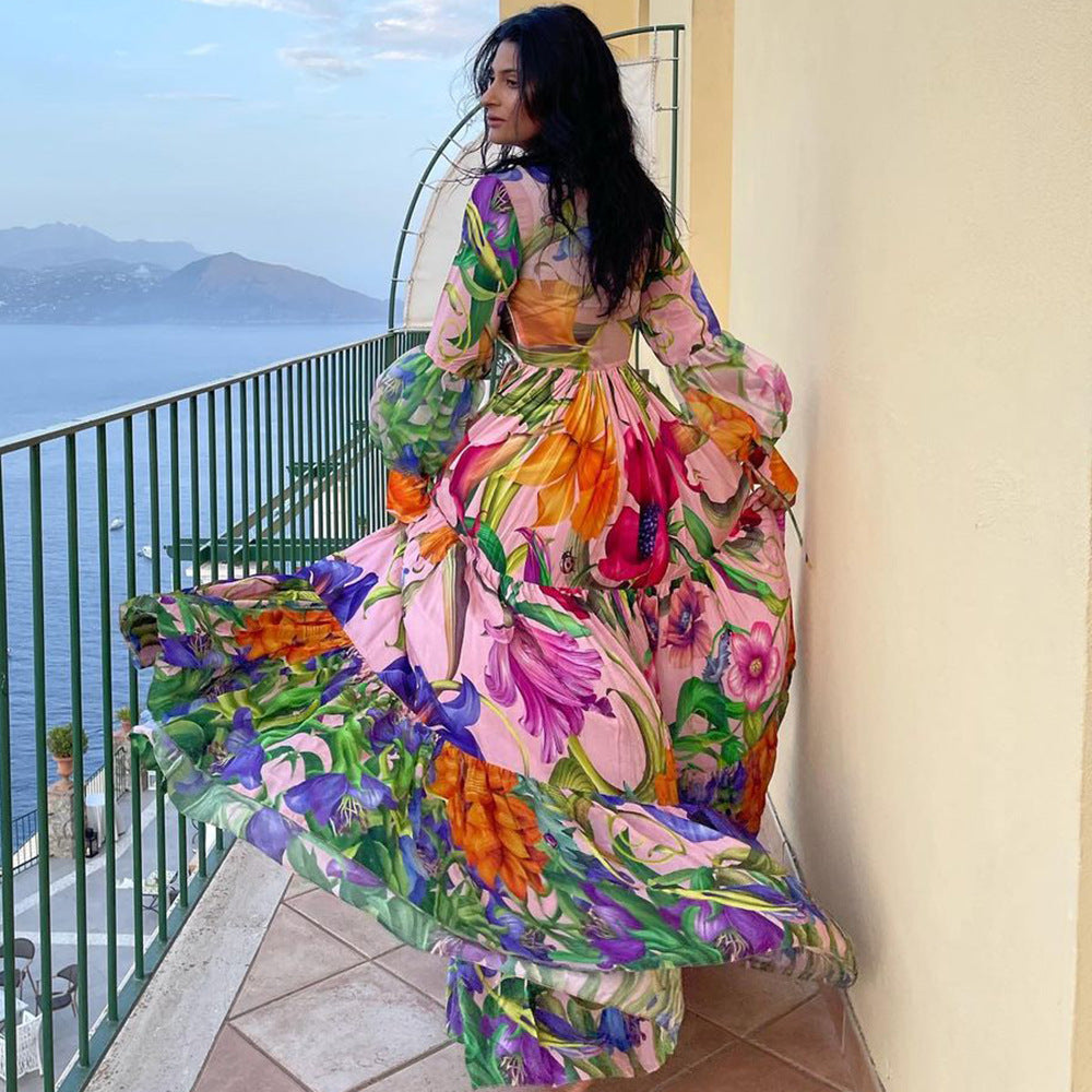 V Neck Bubble Long Sleeve Printed One Piece Swimsuit Women