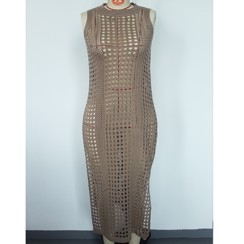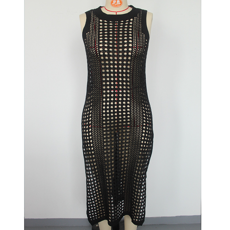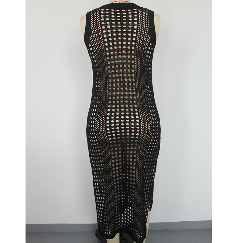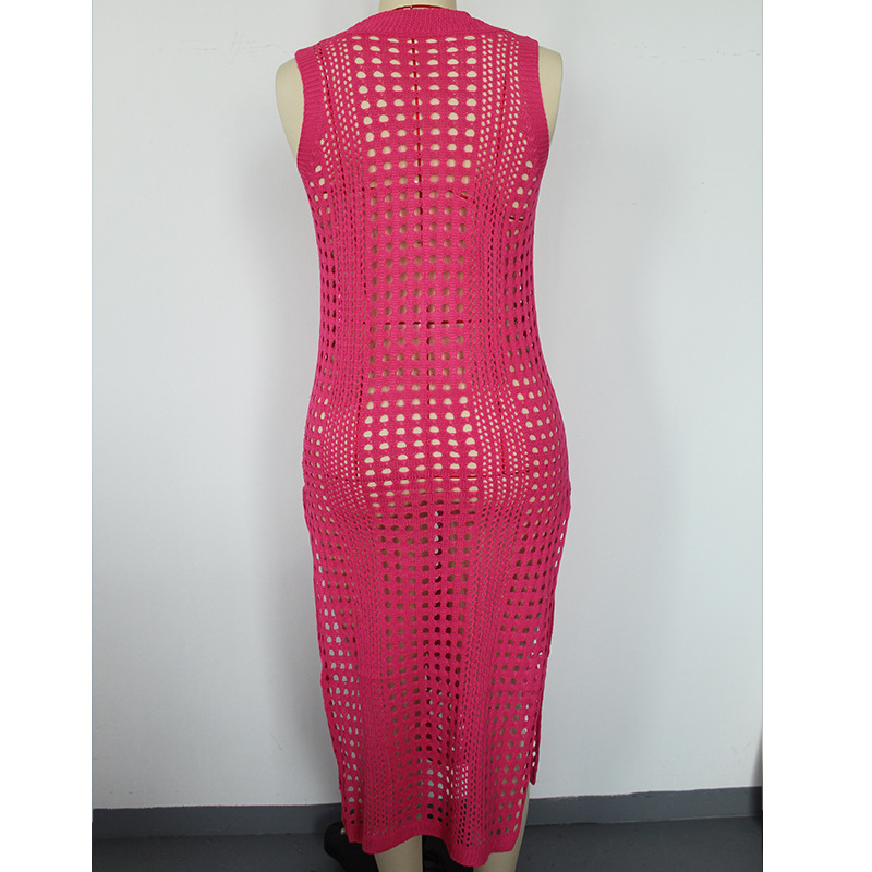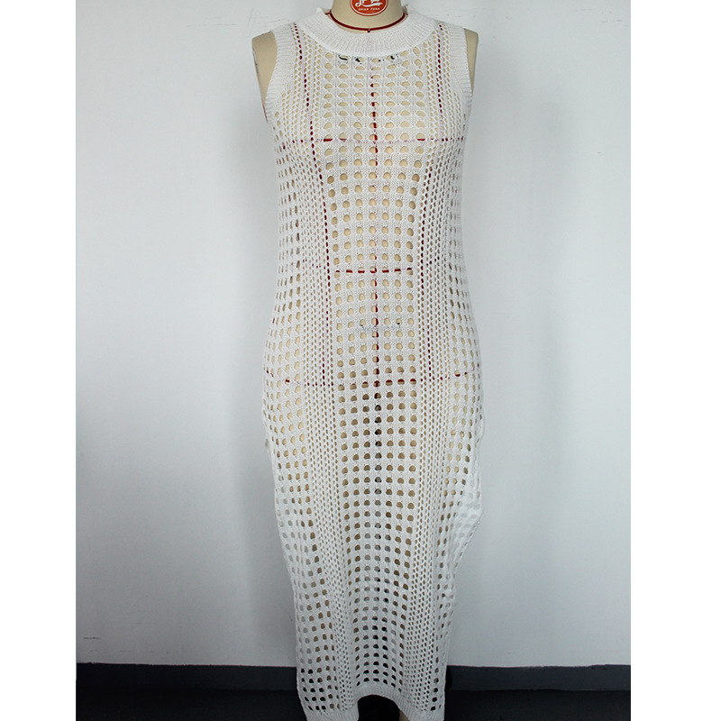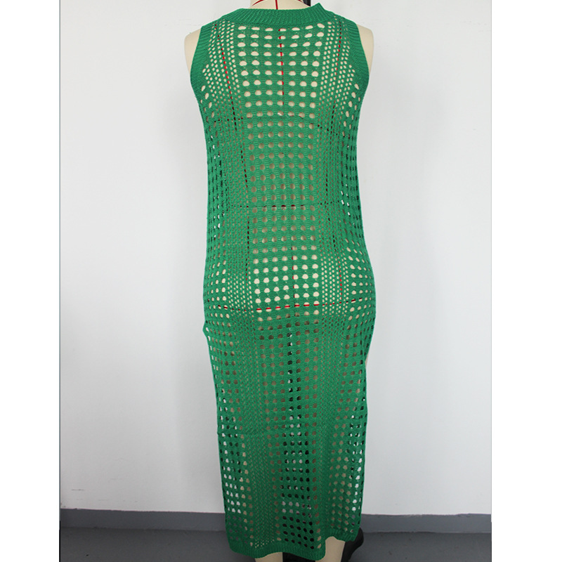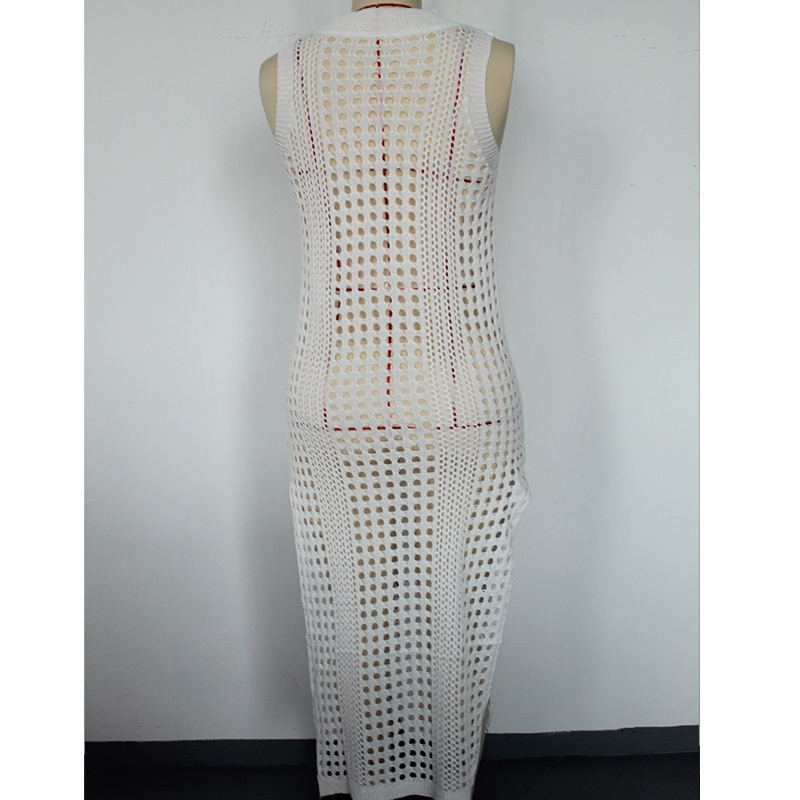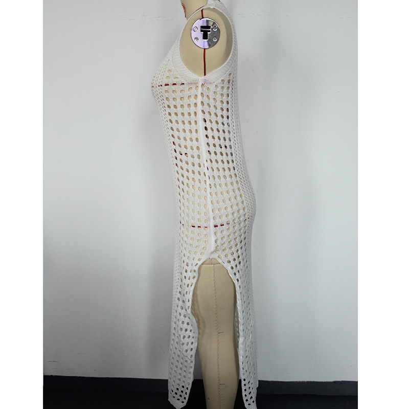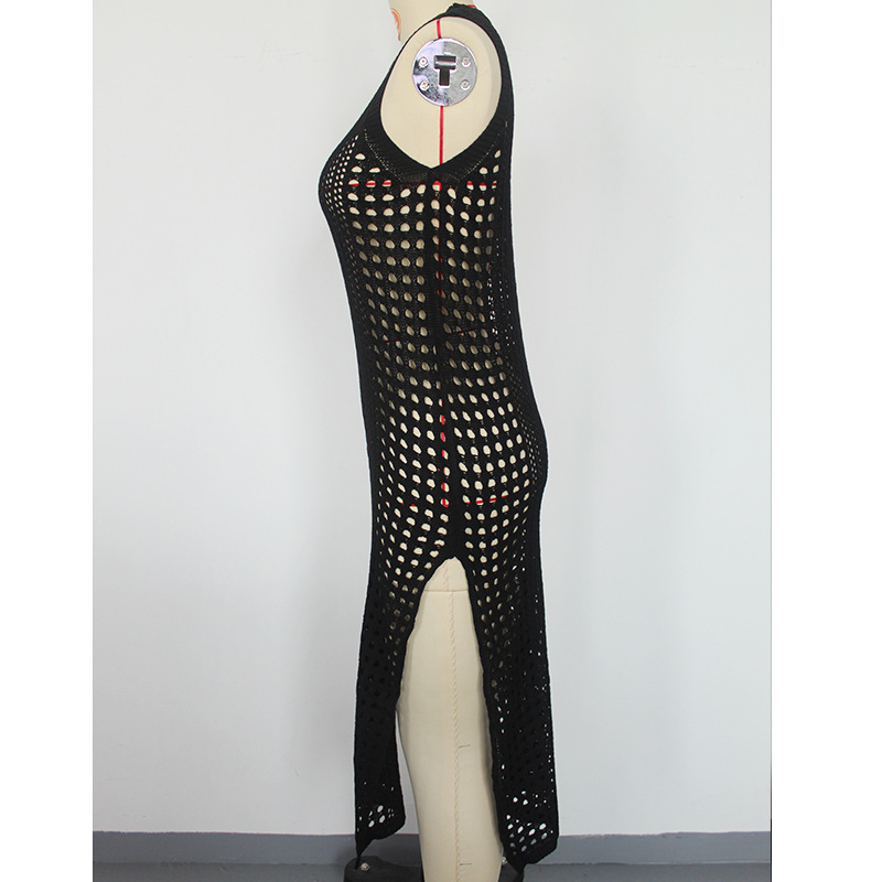 Vacation Sexy Solid Color round Neck Sleeveless Breathable Knitted Long High Slit Dress Beach Sun Protection Blouse Crochet hook