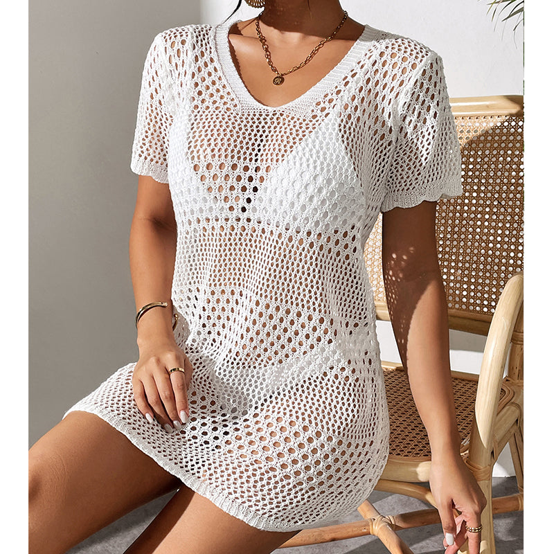 Women Clothes Sexy Cutout Short Sleeve Casual Bikini Cover Up Swimsuit Blouse Beach Sun Protection Shirt Crochet hook