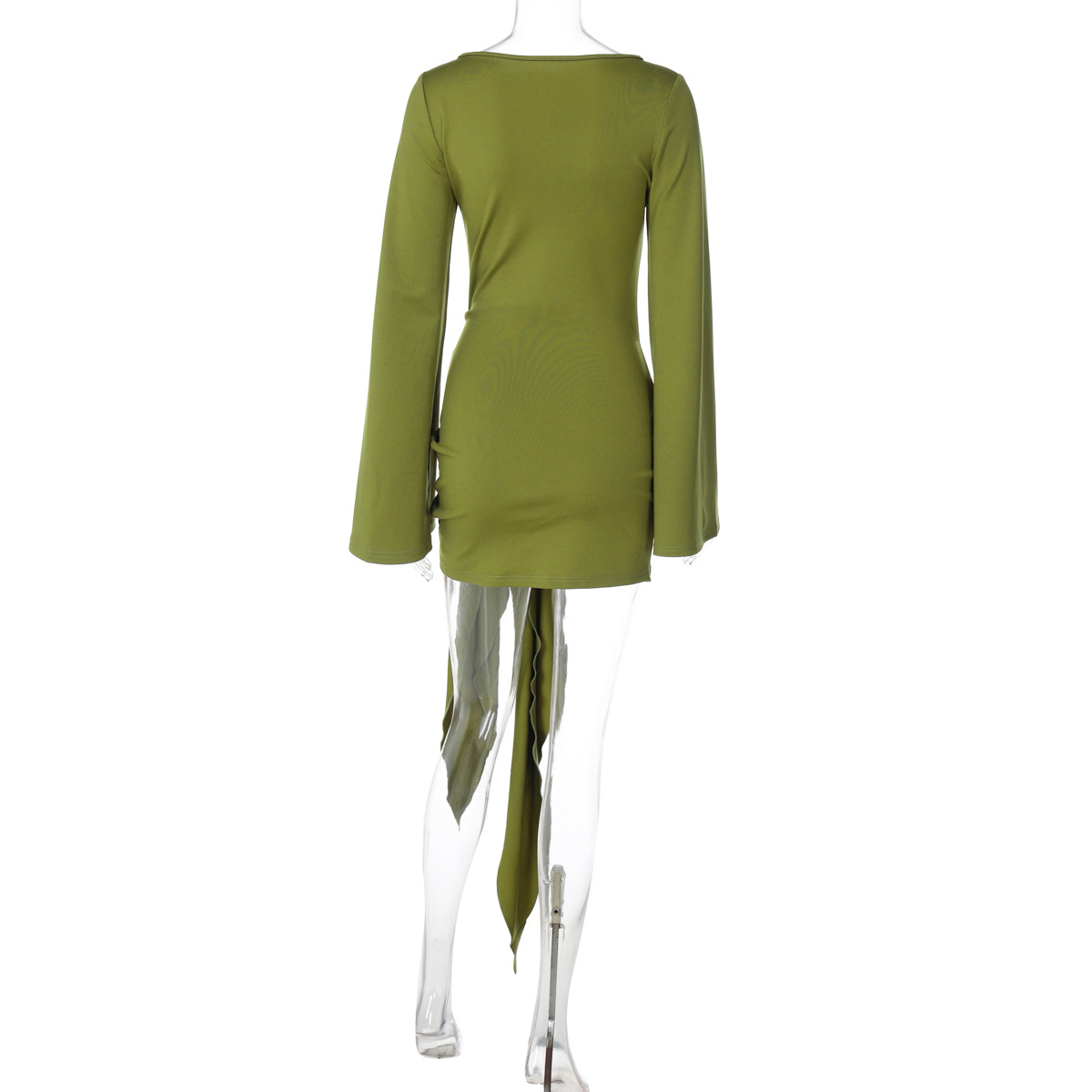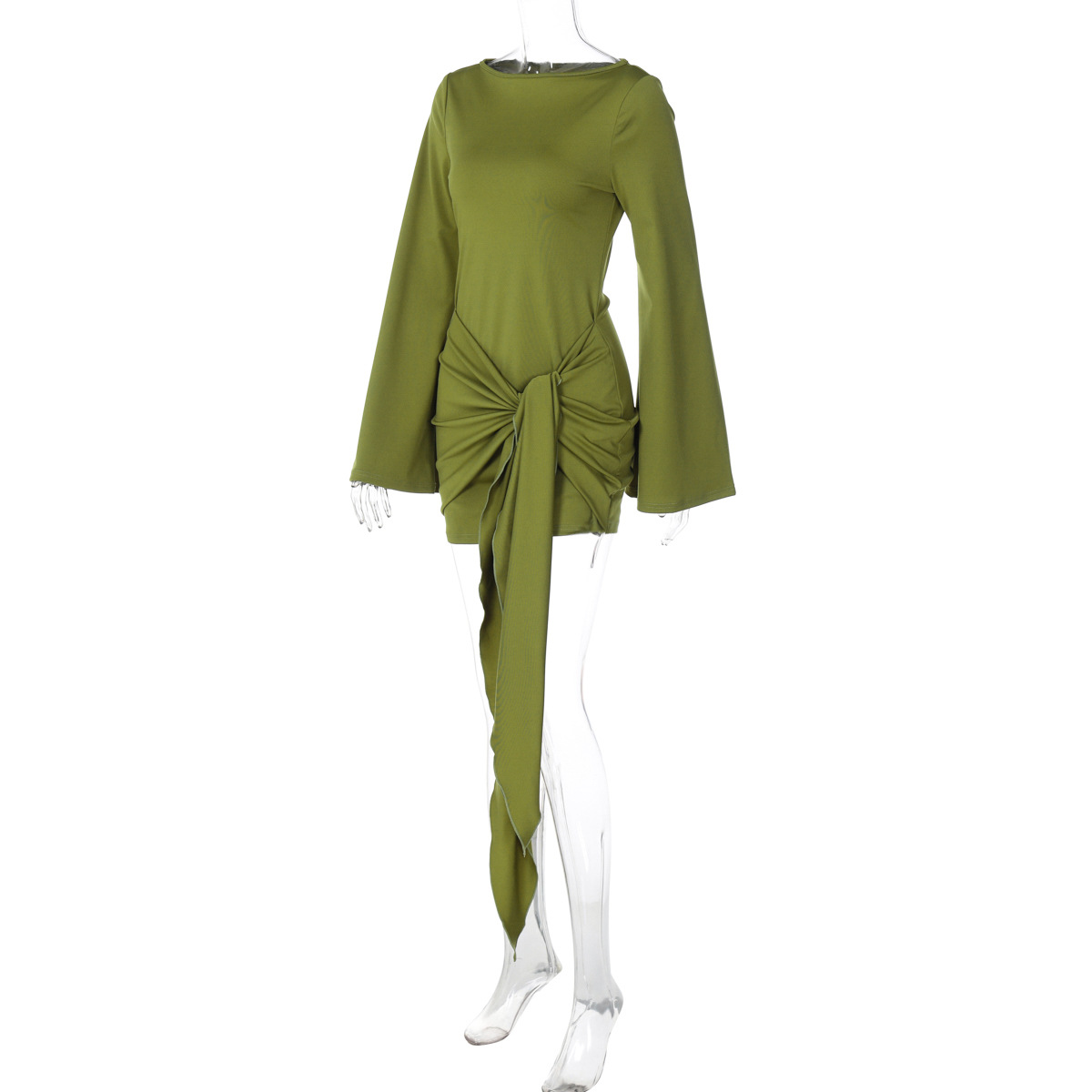 Women Clothing Autumn Solid Color round Neck Pleated Lace up Long Sleeved Slim Fit Short Dress