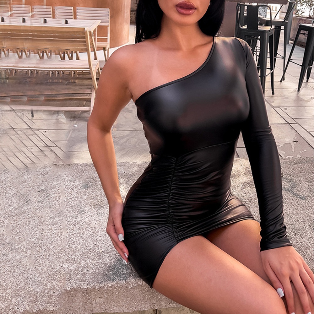 Women Clothing Sexy Oblique Shoulder Single Sleeve Ruffle Hip Dress Faux Leather Nightclub Dress