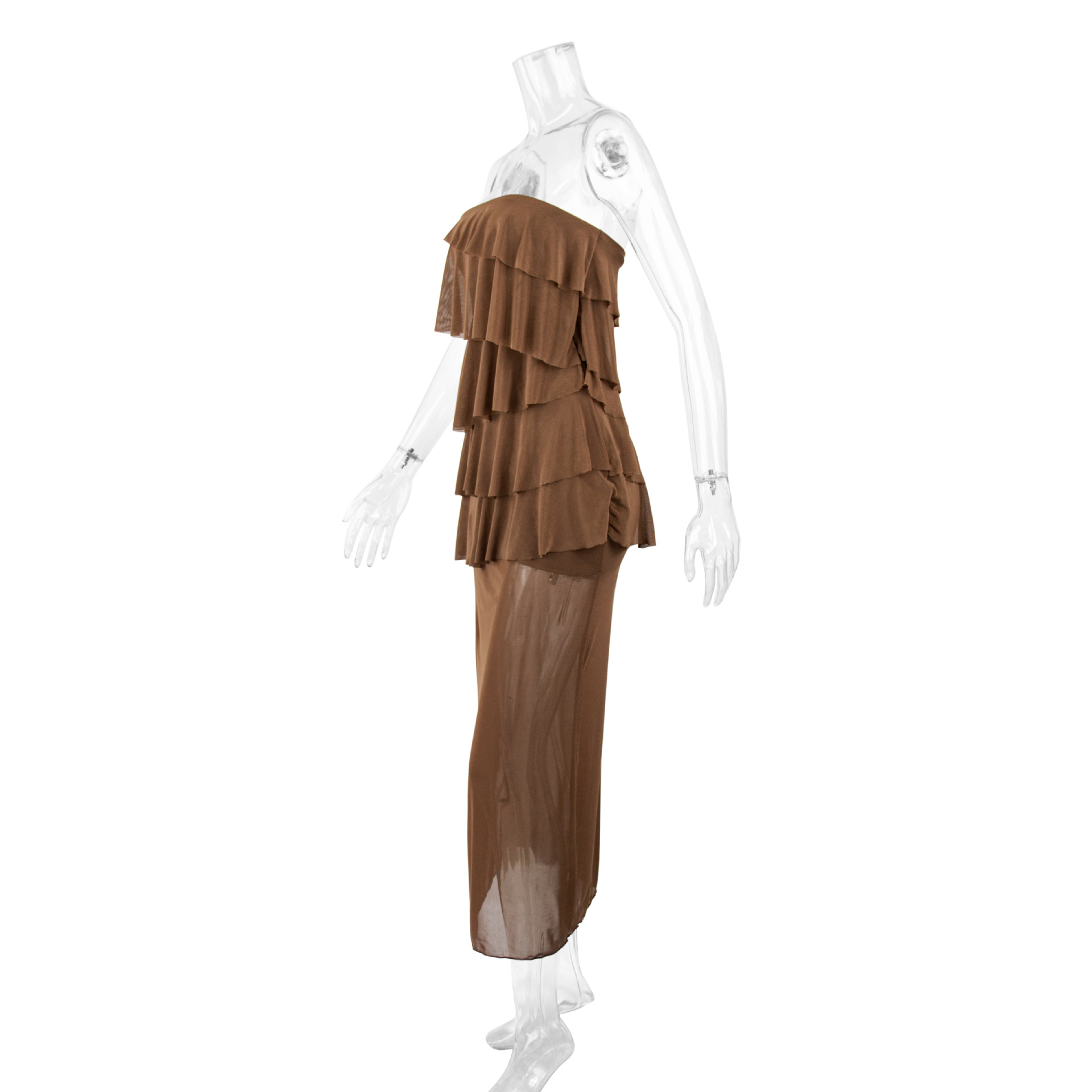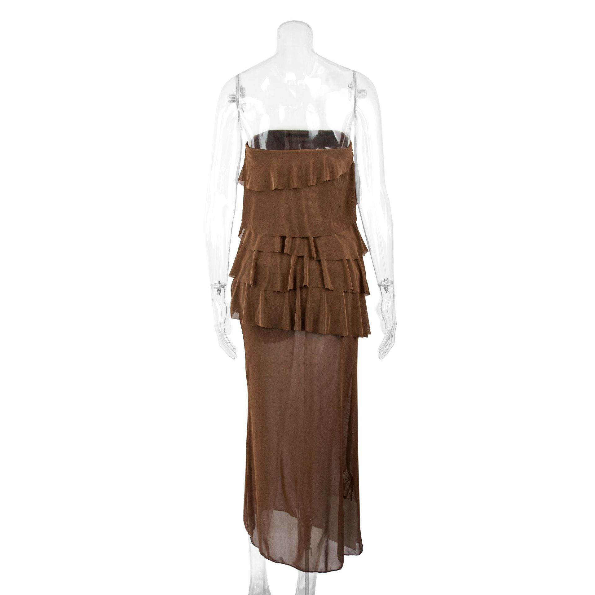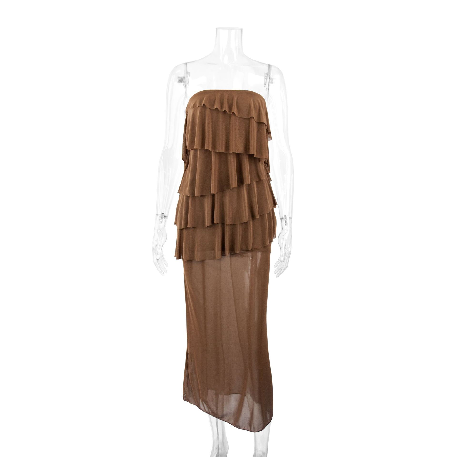 Women Clothing Sexy Sexy Tube Top Layered Ruffled Slim Fitting Patchwork Mesh Irregular Asymmetric Maxi Dress