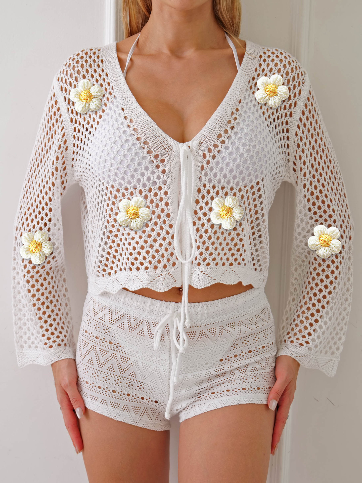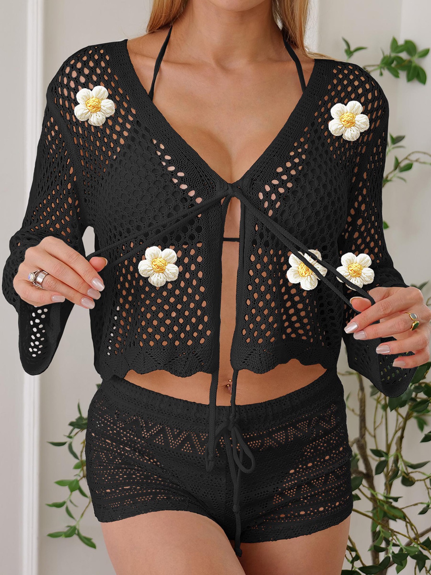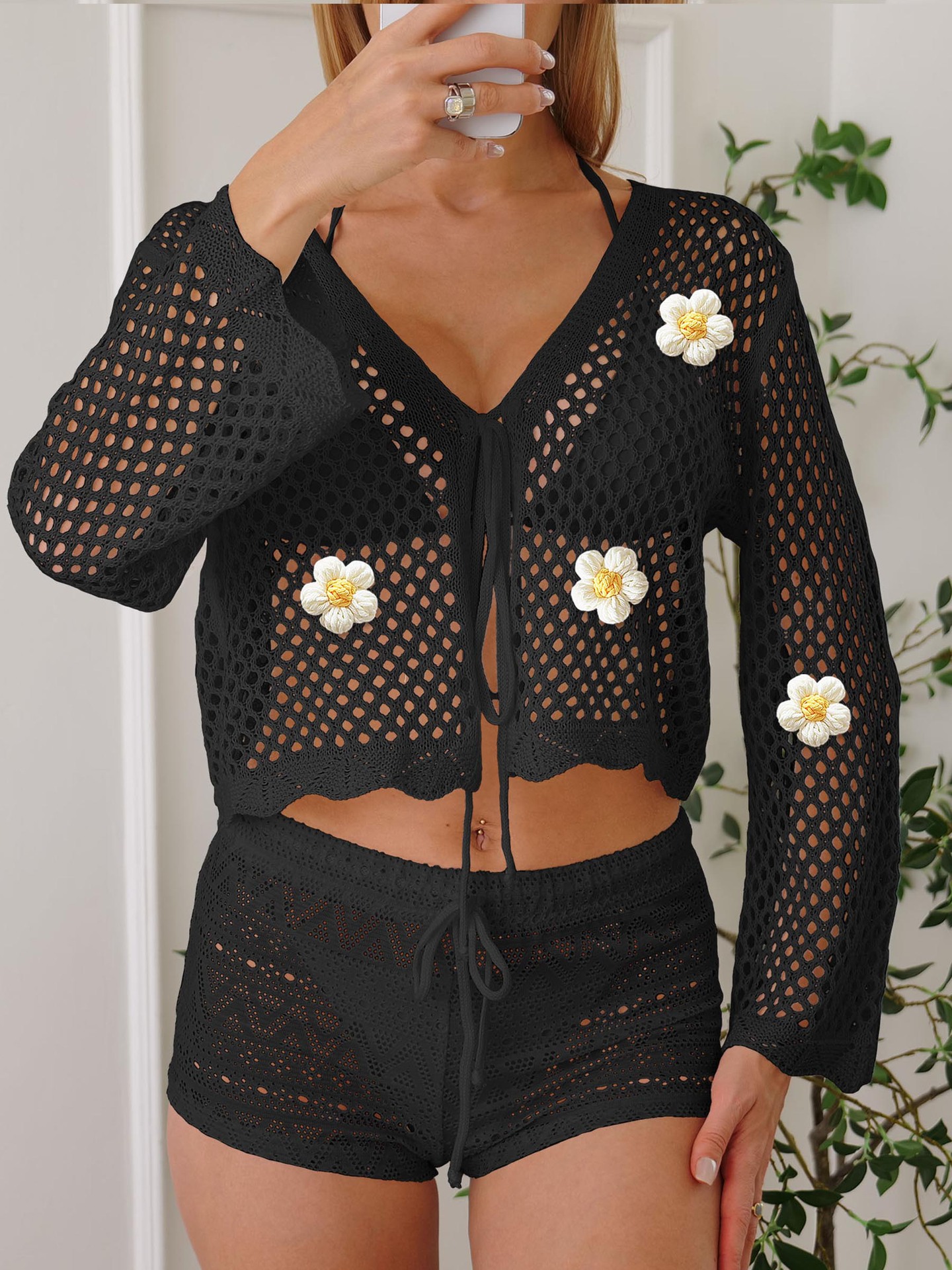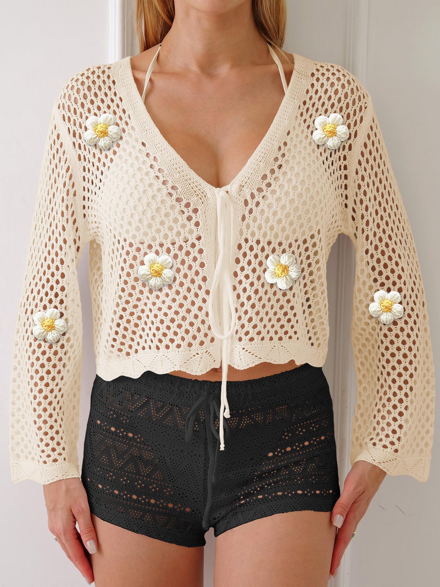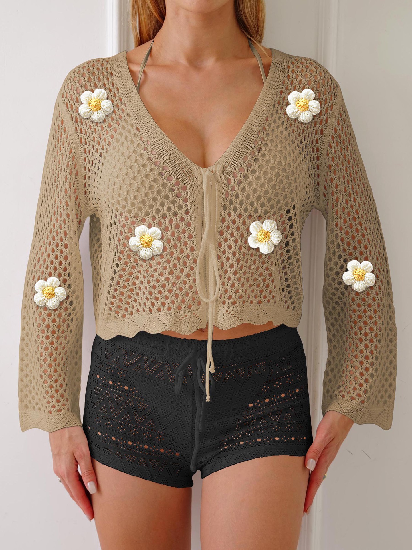 Women Lace up Cardigan Hollow Out Cutout out Woven Shirt Embroidered Floral Stitching Beach Sun Protection Long Sleeved Blouse Casual Coat