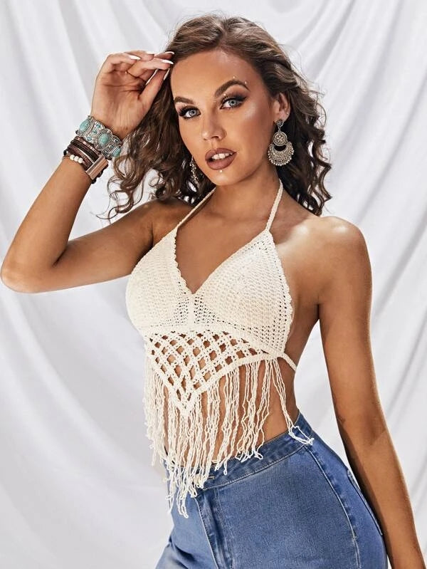 Women Summer Vacation Solid Crochet Fringe Sexy Halter Top Crochet hook
