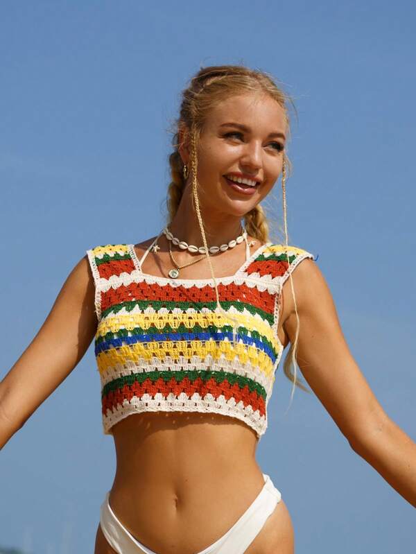 Women Vacation Summer Color Block Crop Top Crochet hook